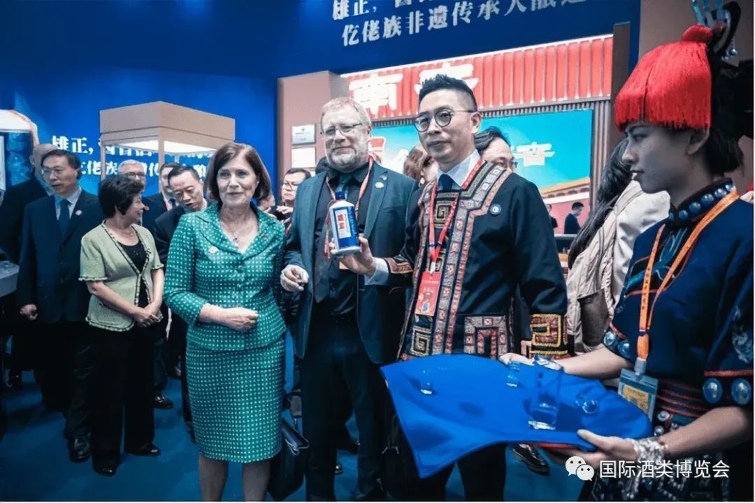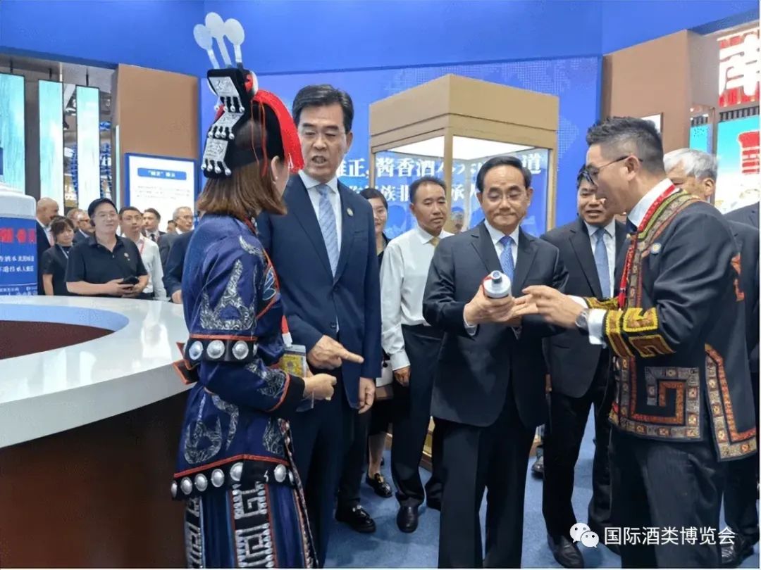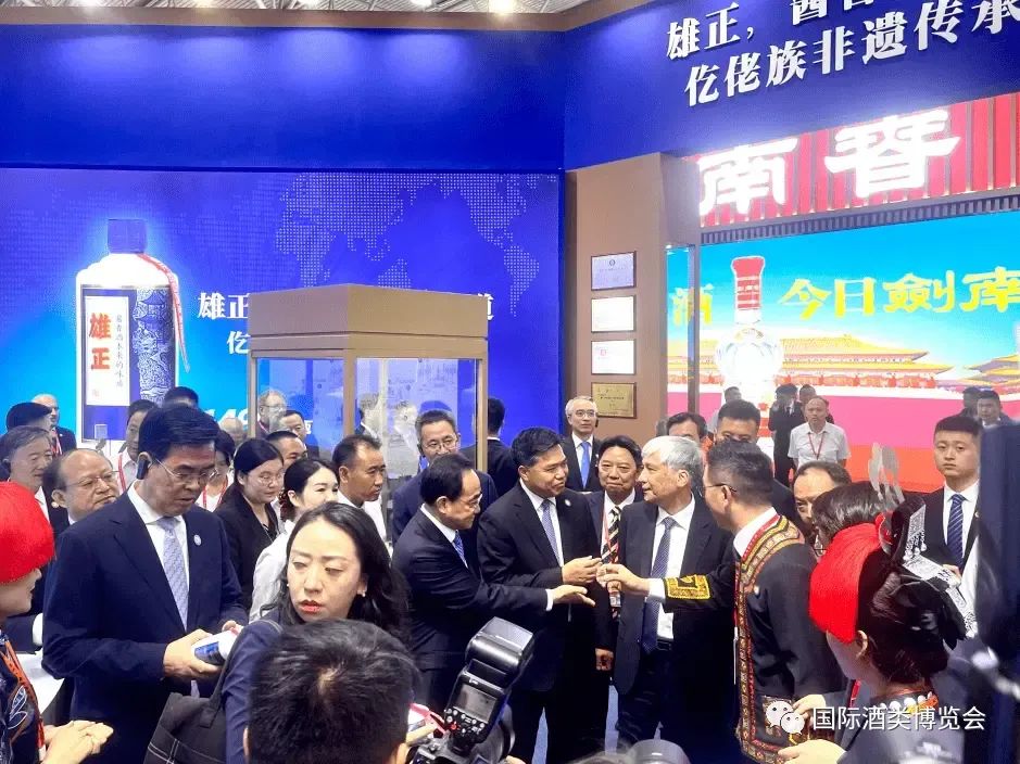 第十二屆中國(貴州)國際酒博會現場,位于名酒館B2-10-1區域的雄正醬香酒,以仡佬族的民族藍色及精心布置展臺,吸引了巡館的第十四屆全國人大常委會副委員長,民盟中央主席丁仲禮,第二十屆中央委員、貴州省委書記、貴州省人大常委會主任徐麟,第二十屆中央委員、貴州省委副書記、省長李炳軍等領導,及國內外政商駐足與品鑒,尤其在得知仡佬族的祖先發明了醬香酒,雄正是仡佬族釀酒技藝非遺傳承企業,且雄正醬香酒享有“雙非遺”和“貴州老字號”多重美譽,雄正集團創始人、董事長張再彬先生作為仡佬族釀酒技藝的唯一非遺傳承人,始終堅持采用仡佬族非遺釀酒技藝親釀調制每一瓶雄正醬香酒后,在場嘉賓不由得紛紛稱贊。